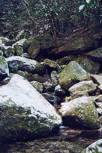 | 段々登って行くうちに日が差さない所には、残雪が ちらほらと見え始めました。 その残雪を発見して甥っ子は「おぉぉ!凄いっ!」を 連発の大はしゃぎ! またまた私が氷柱状になった場所を発見して教える、 これまた大はしゃぎ! 元気だねい、私はもう息が、、、(((^^;; 大体1分おき位に下山してくる人達に遭います。 私達が登り始めたのが丁度お昼過ぎ位だったから 皆さん滝の所でお弁当広げてたんですねい。 でも滝の下は足場が悪いそうなのですが、、、。 段々と空気も冷たくなり、残雪も少し多くなってきた所、 ココは慎重に慎重に、とコケない様に進んで行くと、 前方の山肌に白いものが映っているのが目に、、、 「おっ、もうすぐだぞぉ〜」 1時間半の行程を40分で来てしまいました!(^^) | |