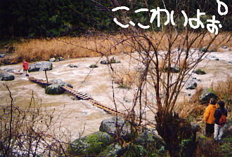 | 通潤橋の所でご夫妻と合流、早速出発! まずはうなぎ滝から、、、 熊本は前日からの雨で川もこのとおり増水!手作りの橋を 渡るのも少し勇気がっ! ![]() |